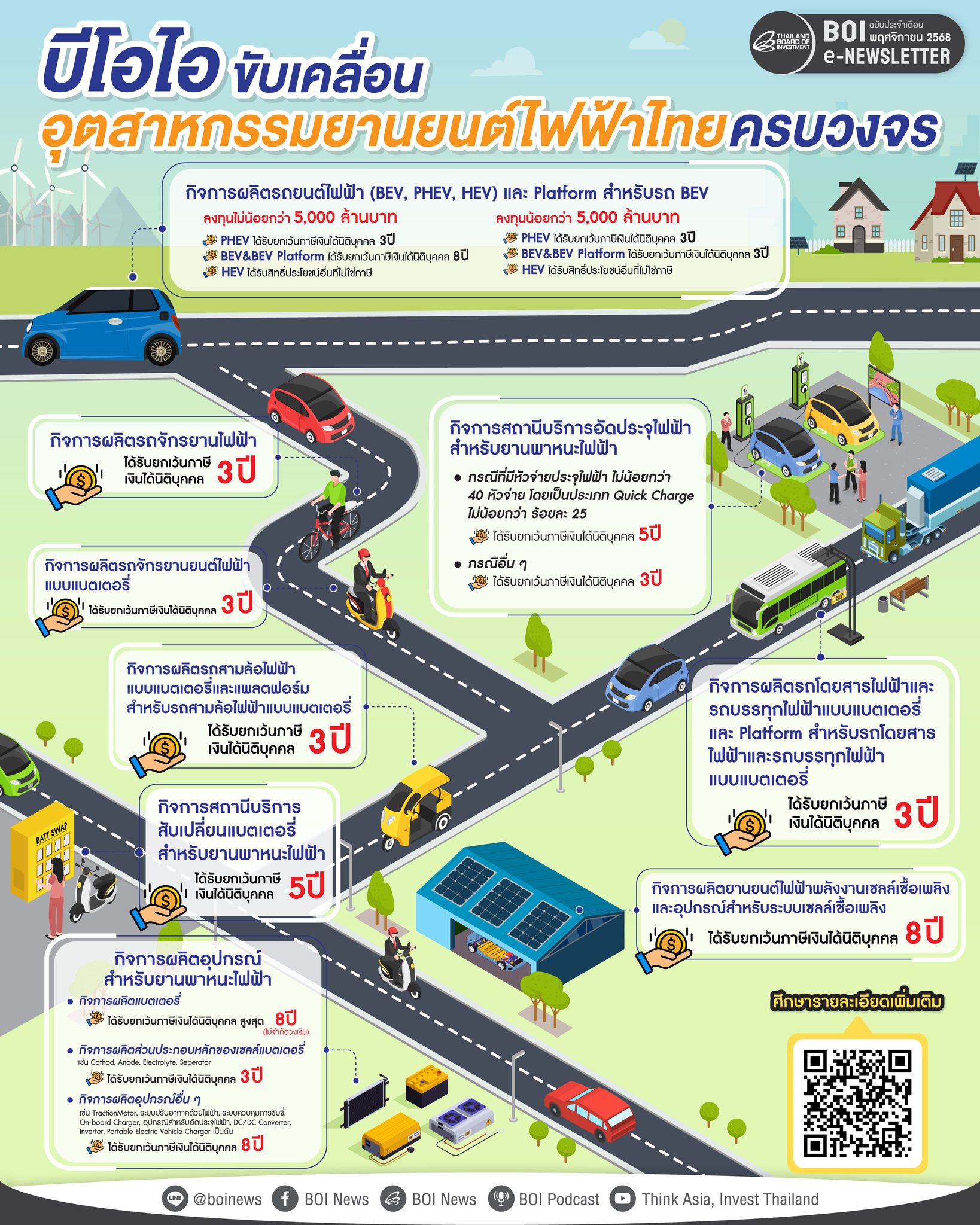 บีโอไอเดินหน้าขับเคลื่อนเศรษฐกิจสีเขียว เปิดสิทธิประโยชน์การลงทุนยานยนต์ไฟฟ้าแบบครบวงจร ครอบคลุมตั้งแต่การผลิตยานยนต์ไฟฟ้า อุปกรณ์และชิ้นส่วนที่เกี่ยวข้อง ไปจนถึงสถานีชาร์จ พร้อมยกเว้นภาษีเงินได้นิติบุคคลสูงสุด 8 ปี (ไม่จำกัดวงเงิน) เพื่อสร้างระบบนิเวศอุตสาหกรรม EV ที่แข็งแกร่ง รองรับเป้าหมายการผลิต 750,000 คัน ภายในปี 2030 และผลักดันให้ประเทศไทยก้าวขึ้นเป็นศูนย์กลางการผลิตและนวัตกรรม EV แห่งอาเซียน