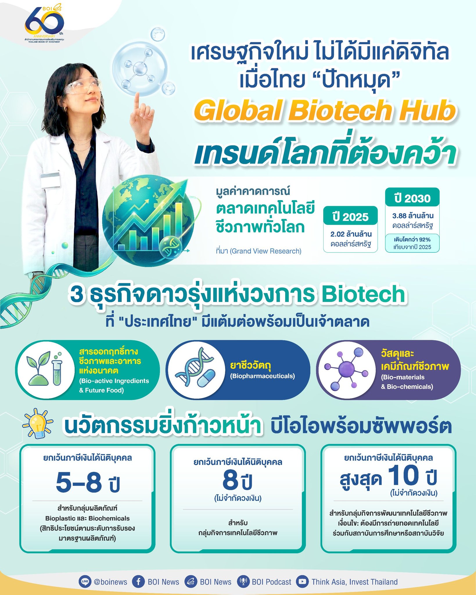ข้อมูลสถิติล่าสุดชี้ให้เห็นว่า ตลาดเทคโนโลยีชีวภาพทั่วโลก (Global Biotechnology Market) จะมีมูลค่าพุ่งสูงถึง 3.88 ล้านล้านดอลลาร์สหรัฐ (หรือราว 130 ล้านล้านบาท) ภายในปี 2030 (อ้างอิง: Grand View Research) หรือคิดเป็นอัตราการเติบโตกว่า 92% เมื่อเทียบจากปี 2025