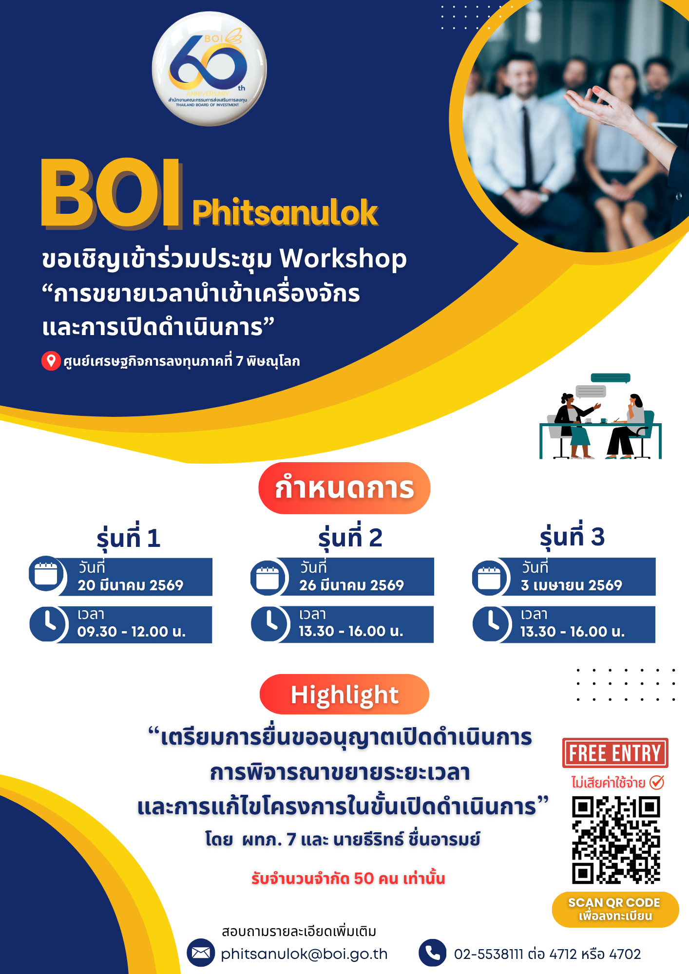 บีโอไอ พิษณุโลก ขอเชิญร่วมสัมมนา เรื่อง "การประชุมเตรียมการและ Workshop การขยายเวลานำเข้าเครื่องจักร และการยื่นขออนุญาตเปิดดำเนินการ" ณ ห้องประชุมสำนักงานชั้น 3 ศูนย์เศรษฐกิจการลงทุนภาคที่ 7 (พิษณุโลก)