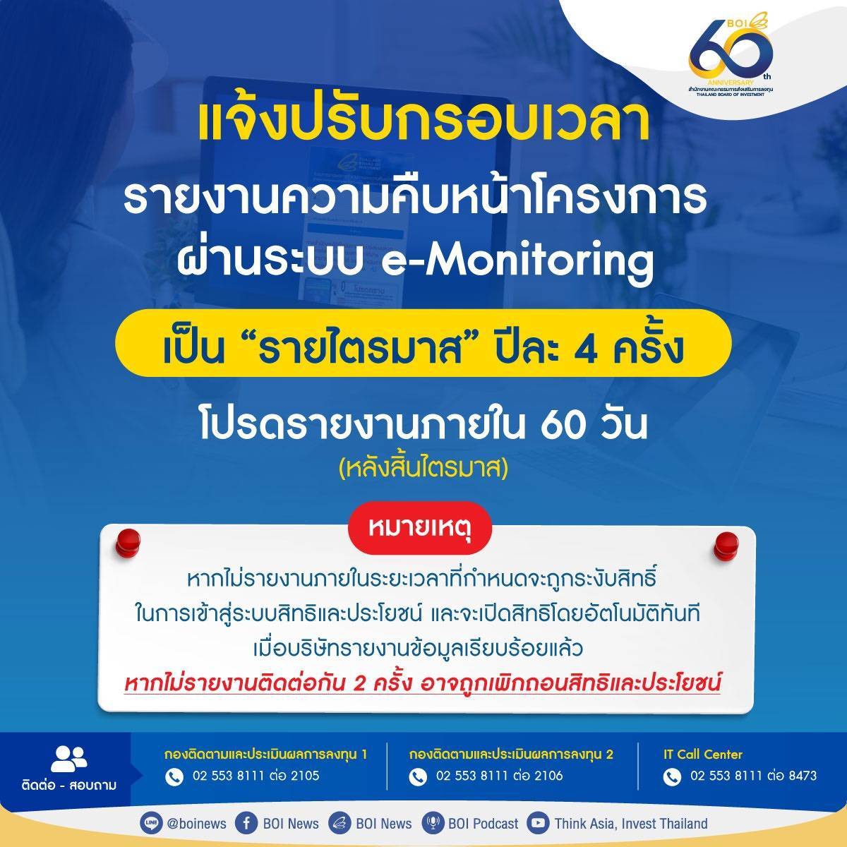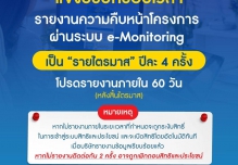 แจ้งปรับกรอบเวลา รายงานความคืบหน้าโครงการผ่านระบบ e-Monitoring เป็น "รายไตรมาส" ปีละ 4 ครั้ง โปรดรายงานภายใน 60 วัน